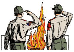 Destroying Worn-Out FlagsWhen the national flag is worn beyond repair, burn it thoroughly and completely on a modest, but blazing, fire. This should be done in a simple manner with dignity and respect. Be sure the flag is reduced to ashes unrecognizable as a former flag. |